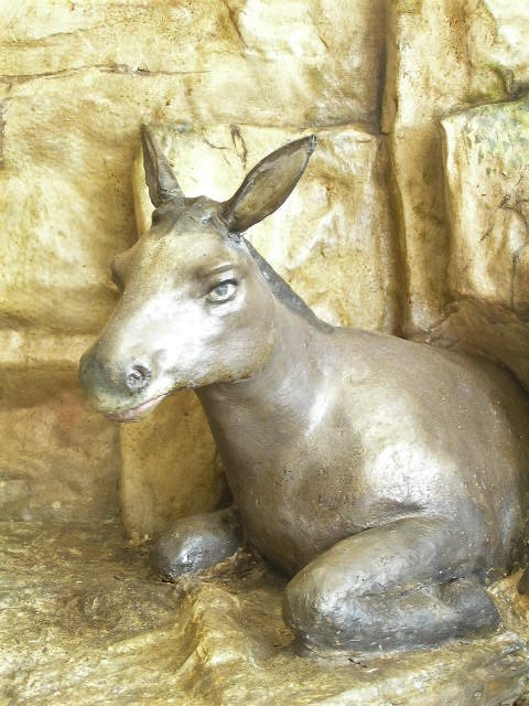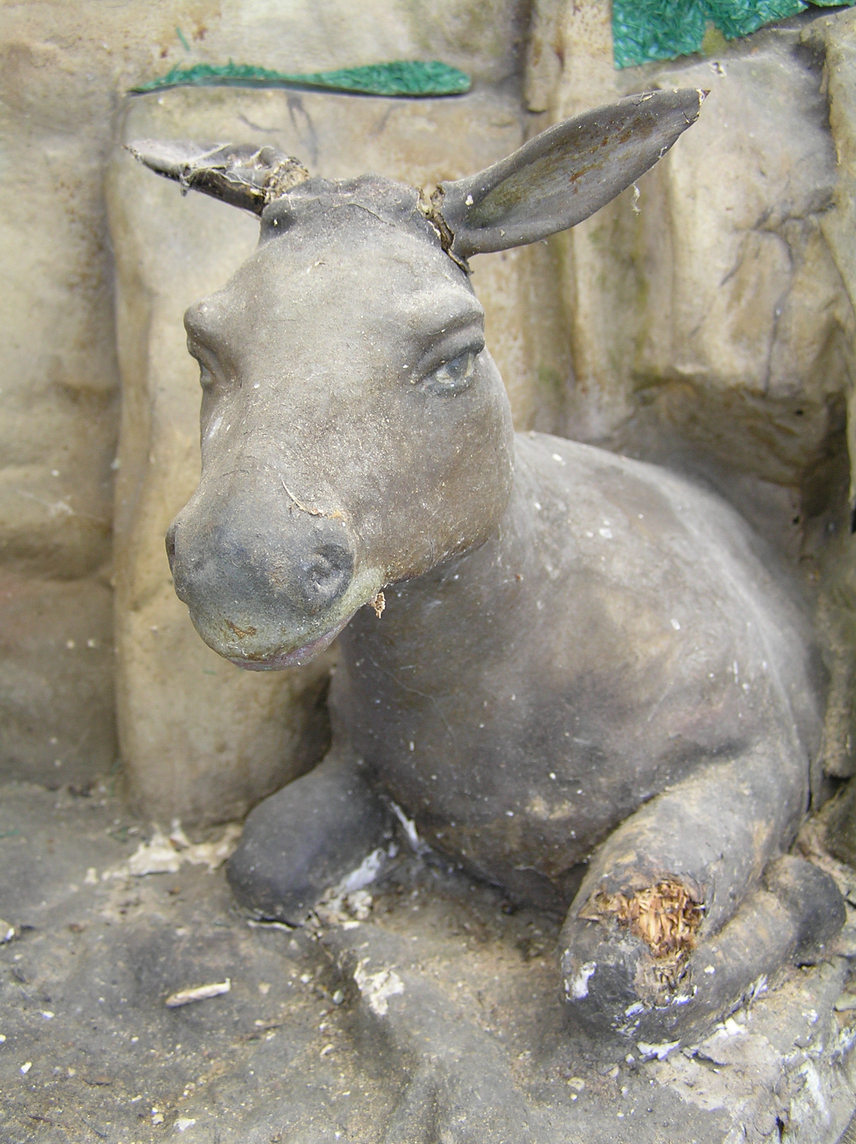 La costruzione ,formata da assi di legno alternate, è rivestita di cartapesta ingessata e colorata, ad imitazione della roccia con foglie dipinte ; ne fanno parte il bue e l’asino ugualmente rivestiti , con un riempimento di fibre vegetali. ( vedi foto )