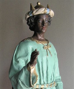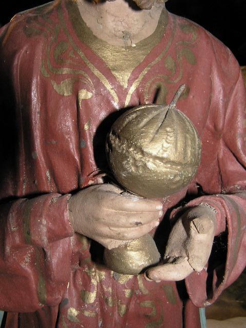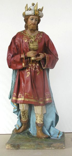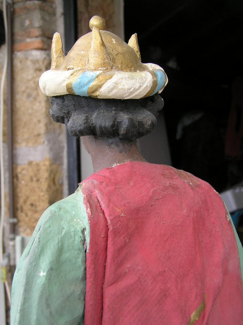 Nelle foto sopra: uno dei Re Magi  in fase di stuccatura e dopo il restauro.