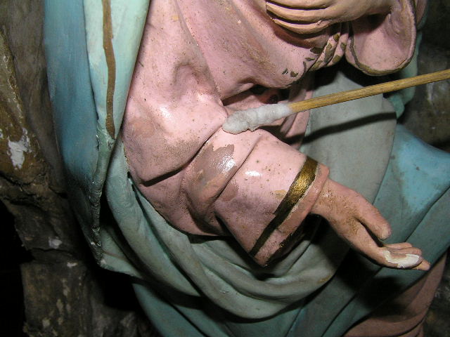 Per la pulitura, sia del fondale che delle statue, sono stati usati batuffolini di ovatta imbevuti in soluzione acquosa di desogen (tensioattivo e fungicida).