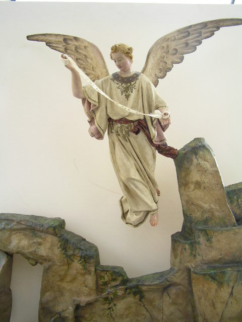 Era in stato di abbandono, coperto di depositi polverosi ed organici; con strappi, fori, rotture e mancanze sia nel fondale che nelle statue (un piede dell’angelo era staccato). Nel tentativo di migliorarlo, erano stati applicati inserti di prato sintetico sulla roccia e sulla base di molti personaggi.